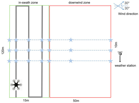 A test field with a length of 120 m and a width of 65 m was selected for the UASS spraying tests, as shown in Figure 3. The test area of the spray field was divided into two parts, namely the in-swath zone and the downwind zone. By continuously observing the wind vane on the meteorological station for a long time, the direction of the sample line was 330° according to the ISO 22866 methodology [30], ensuring that the angle between the sample line and the wind direction shall be within ±30°. To truly reflect the droplet deposition distribution during the actual operation of the UASS, the UASS conducted spray tests on three consecutive routes. The effective swath was 5 m according to the UASS’s flight technical instruction. Three parallel sampling lines were designed to be equally placed at 10 m in the middle of the test field.