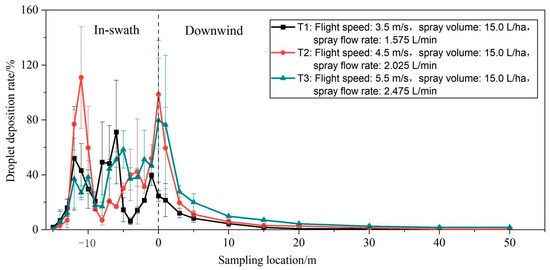 Table 4 summarizes the parameters of in-swath droplets deposition. The maximum and minimum values of deposition rate at each sampler of T2 were the highest and lowest in the groups, which were 110.9% and 0%, respectively. Through CV value analysis, it is found that the uniformity of droplet deposition rate of T3 was better than that of T1 and T2. The average droplet deposition rate comparison indicates that the mean deposition rate of T2 was 33.1% and 8.8% higher than that of T1 and T3, respectively. Simultaneously, an examination of the droplet coverage data in Table 4 reveals that T2 exhibited the highest droplet coverage, which was 5.5%. At this point, the average DV0.5 of T2 (307 μm) was smaller than that of T1 (323 μm) and T3 (360 μm). Based on the above analysis of deposition rate parameters, when the flight speed was 4.5 m/s, the spray flow rate was 2.025 L/min and the spray volume was 15.0 L/ha, the deposition efficiency of droplet sprayed by UASS was the highest in the spray range.