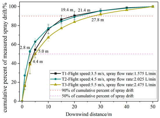 By comparing the relationship between flight speed and droplet drift, as illustrated in Figure 7d, it can be observed that the three test groups exhibited a systematic distribution of droplet drift, with the curves arranged from top to bottom as T8, T7, and T9. For the T7 and T9 test groups, the drift distances corresponding to 50% cumulative percent of spray drift were 5.8 m and 8.5 m, respectively, while the drift distances corresponding to 90% cumulative percent of spray drift were 27.5 m and 28.8 m, respectively. This indicates that higher speeds result in greater drift distances. In the T8 test group, the rapid change in wind direction weakened the airflow intensity in the downwind direction. Consequently, compared to the T7 and T9 groups, the drift distances corresponding to 50% and 90% cumulative percent of spray drift were both shorter.