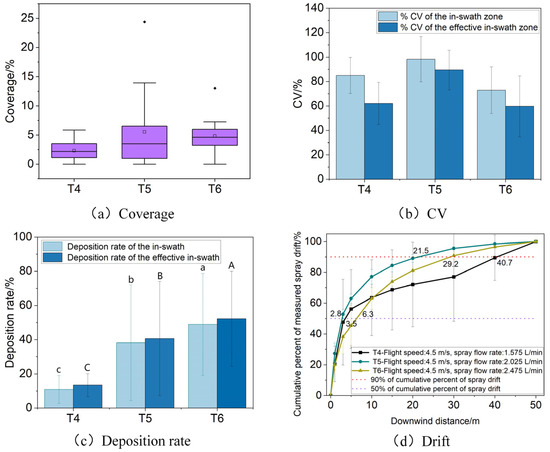 To conduct a more comprehensive analysis of droplet deposition performance under various conditions, we calculated and analyzed the deposition rates based on the collected droplet deposition data. As shown in Figure 6c, in the spray swath area, the droplet deposition rate was lower than that in the effective spray swath area. The droplet deposition rate within the spray swath area can reflect the extent of droplet deposition within the operational area. However, the droplet deposition rate within the effective spray swath area mitigates the impact of crosswinds to some extent, providing a more accurate representation of the influence of spray flow rate on droplet deposition quality. Furthermore, it offers a more realistic reflection of the droplet deposition status on the target crop. The deposition rate of T4 (13.4%) was significantly lower than that of T5 (40.7%) and T6 (52.2%) for the effective in-swath, and there were significant differences among them. It is worth noting that the flow rates of T4, T5, and T6 were 1.575, 2.025, and 2.475 L/min, respectively. In the case of the same nozzle, the flow rate is regulated by adjusting the liquid pressure through the liquid pump. The liquid pressure during spraying directly affects the droplet size and velocity after atomization. High hydraulic pressure results in the formation of smaller droplets with higher velocity [33]. The initial droplet size and velocity altered the trajectory of droplets in the air, which led to variations in their deposition pattern within the target zone. Therefore, it can be concluded that for UASS used for spraying, under higher spray flow rates, the deposition rate within the spraying area increases, indicating that the droplet velocity can overcome the disadvantage of smaller droplet size and resist droplet drift. Additionally, external airflow and the flight conditions of the aircraft are significant factors influencing droplet movement.