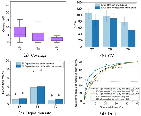 The droplet deposition characteristics and drift risk under different flight speeds. (a) Coverage distribution from the T7–T9 experimental groups. (b) The deposition uniformity performance of the in-swath zone and the effective in-swath zone. (c) The deposition rate distribution of the in-swath zone and the effective in-swath zone. Different letters for the same color group indicate significance at the 95% level. (d) The cumulative percentage of measured spray drift and drift distance.