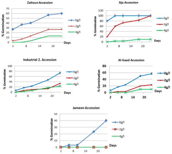 Seed germination of C. ciliaris of all accessions was highest in distilled water (0 g NaCl/L). During the experiment period, the survival rate presented the same behavior trend. The C. ciliaris seeds established well under moderate rainfall conditions, equivalent to 250 mm. The highest germination rate was observed at Aja accession with 100% of germination. The increase in salt concentration in water was followed by a decrease in germination percentage. Aja was the most salt tolerant accession, germinating fully at 2 g NaCl/L after 20 days. Jameen was the most sensitive accession to salt with 0% germination in 2 and 4 g NaCl/L (Figure 2).