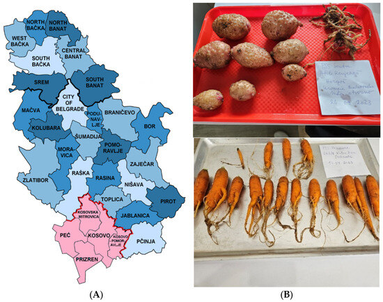 (A) Samples were collected between 2021 and 2023 from the regions of Northern and Central Serbia, highlighted in blue with the border depicted by a bold black line between Northern Serbia (7 districts) and Central Serbia (18 districts). Samples were not collected in 5 districts, highlighted in red on this map. Map is from https://en.wikipedia.org/wiki/Administrative_districts_of_Serbia (accessed on 8 January 2025). (B) Symptoms caused by M. incognita (Kofoid and White, 1919) Chitwood, 1949, on potato (Solanum tuberosum L.) and M. arenaria (Neal, 1889) Chitwood, 1949, on carrot (Daucus carota subsp. sativus Hoffm.).