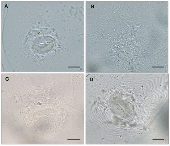 Perineal patterns in Meloidogyne specimens: (A) M. hapla Chitwood, 1949; (B) M. incognita (Kofoid and White, 1919) Chitwood, 1949; (C) M. arenaria (Neal, 1889) Chitwood, 1949; (D) M. luci Carneiro et al., 2014. Bar = 20 μm.