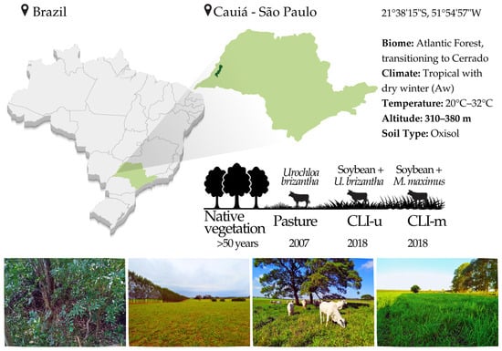 | Crop–Livestock Integration Systems | From 2007 to 2018, the area was managed under a pasture monoculture system with Urochloa brizantha as the primary forage, exclusively used for livestock grazing. In 2018, the system transitioned to crop–livestock integration (CLI). To improve soil conditions, 1.5 t ha−1 of dolomitic limestone was applied in August, followed by 5 t ha−1 of chicken manure and organic compost in September (nutrient composition unknown). In November, the area was desiccated, mowed, and divided into four fields (R5–R8, ~50 ha each). Between November 18 and 22, 2018, soybean (Glycine max) cultivars (BRS 7380 RR, AS 3730 IPRO, NS 6700 IPRO) were sown using no-till management. Fertilization included 250 kg ha−1 of monoammonium phosphate (MAP, 11% N, 52% P2O5) and 150 kg ha−1 of potassium chloride (KCl, 60% K2O). The first soybean harvest occurred in April 2019. Subsequently, the area was subdivided into 13 paddocks, and a mixed pasture of millet (Pennisetum glaucum) and Urochloa ruziziensis was established. Rotational grazing was implemented in three cycles during 2019, with stocking rates ranging from 57 to 205 AU ha−1. Canopy uniformity was maintained by mowing fields R5 and R6 after the first grazing cycle. In November 2019, after the desiccation of the pasture, the second soybean crop was planted and harvested in April 2020. Post-harvest, the CLI system continued with mixed pastures incorporating millet and different forage species: Urochloa brizantha (cv. Marandu), Megathyrsus maximus (cv. Mombaça), and U. brizantha (cv. Piatã) combined with Sorghum bicolor (cv. Pódio) for silage. At the time of soil sampling, only permanent pastures (U. brizantha and M. maximus) remained, classified as CLI-u (with U. brizantha) and CLI-m (with M. maximus). |