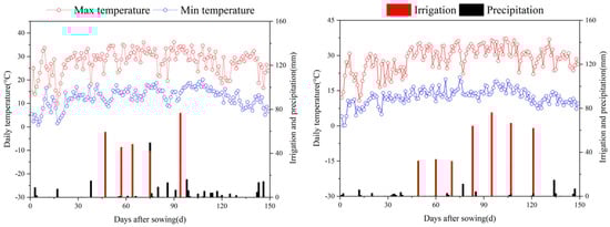 Daily maximum and minimum temperatures, precipitation, and full irrigation amount during the growing seasons of maize in 2022 and 2023.