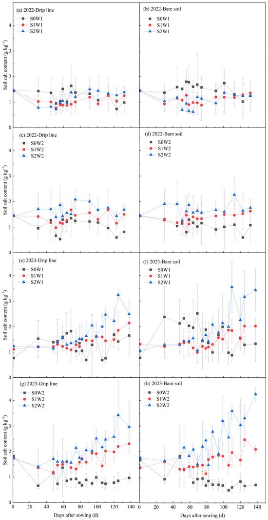 The relatively large error bars in the soil water–salt data likely result from several factors, including uneven distribution from the drip irrigation system, soil heterogeneity, interactions between water and salt content, environmental fluctuations, and potential issues with experimental design and sampling. We recommend optimizing the drip irrigation system, increasing experimental replications, standardizing soil sampling methods, and controlling environmental variations during data analysis in future studies to reduce data variability and enhance the reliability of results.