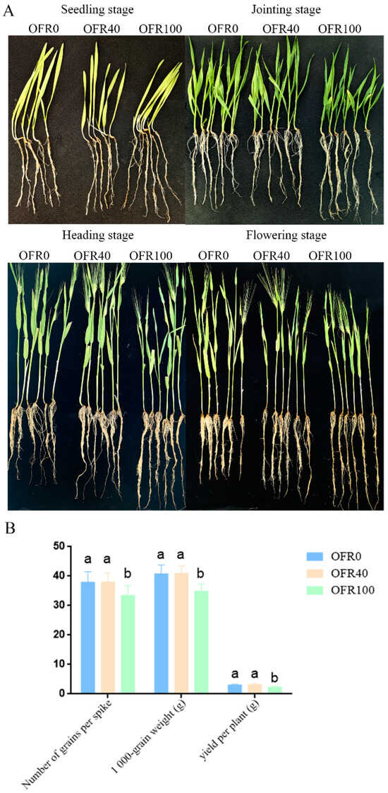 Phenotypic characterization of highland barley under three fertilization treatments. (A) Chemical fertilizer at the conventional rate (OFR0), 60% chemical fertilizer + 40% organic fertilizer (OFR40), and 100% organic fertilizer (OFR100) were used in this study; the effects of these treatments on highland barley were analyzed at the seedling stage, jointing stage, heading stage, and flowering stage. (B) The highland barley yield (including the number of grains per spike, 1000-grain weight, and yield per plant) under three fertilization treatments was analyzed. Different letters represent statistically significant differences among OFR0, OFR40, and OFR100 (p < 0.05, two-way ANOVA).