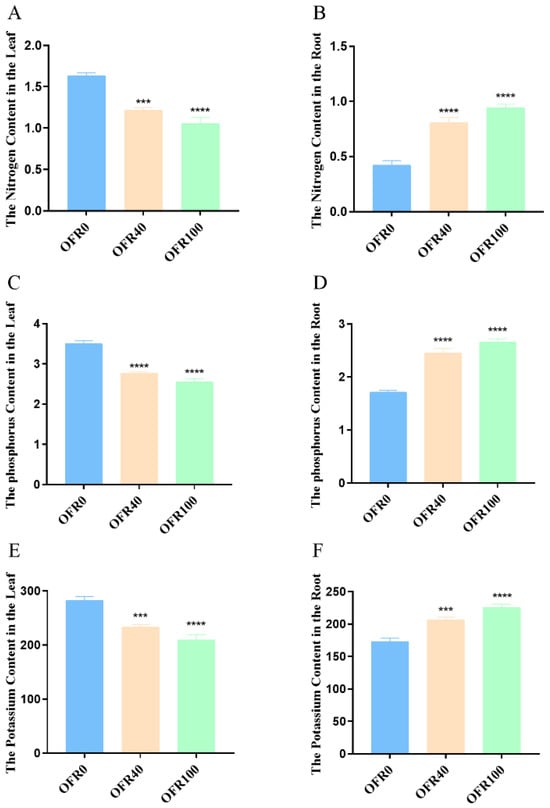 Effect of different fertilizer treatments on highland barley nutrient uptake. This study examined the effects of fertilizer treatments, designated as OFR0, OFR40, and OFR100, on the levels of nutrient uptake in highland barley. (A) The nitrogen content in the leaf. (B) The nitrogen content in the root. (C) The phosphorus content in the leaf. (D) The phosphorus content in the root. (E) The potassium content in the leaf. (F) The potassium content in the root. Asterisks indicate statistically significant differences among OFR0, OFR40, and OFR100 (*** p < 0.001, and **** p < 0.0001, one-way ANOVA).