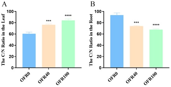Effects of different fertilizer treatments on the C/N ratio of highland barley. This study examined the effects of fertilizer treatments, designated as OFR0, OFR40, and OFR100, on the C/N ratio in highland barley. (A) The C/N ratio in the leaf. (B) The C/N ratio in the root. Asterisks indicate statistically significant differences among OFR0, OFR40, and OFR100 (*** p < 0.001, and **** p < 0.0001, one-way ANOVA).