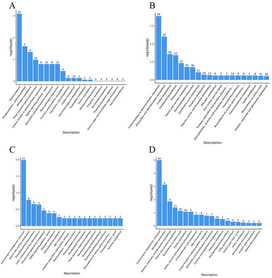 KEGG pathway analysis shows the top 20 enriched terms associated with the differentially expressed genes (DEGs) of highland barley under different fertilizer treatments. The enriched pathways in the (A) OFR40–L vs. OFR0–L, (B) OFR100–L vs. OFR0–L, (C) OFR40–R vs. OFR0–R, and (D) OFR100–R vs. OFR0–R comparison groups.