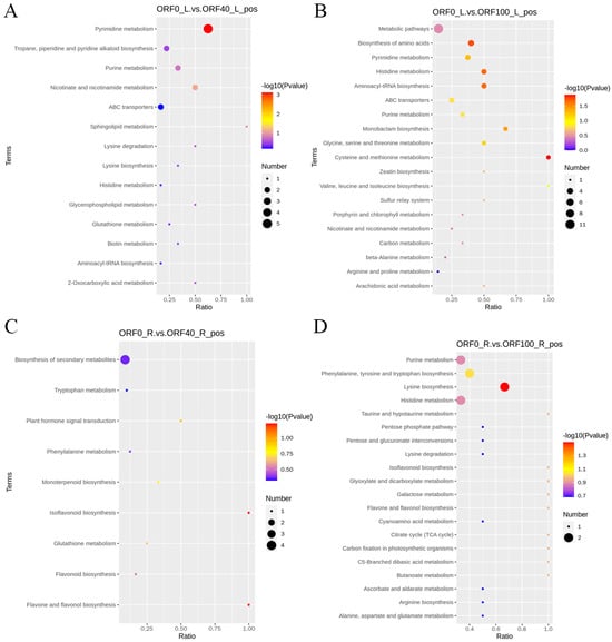 Bubble diagrams of top 20 KEGG pathways enriched by the differentially accumulated metabolites (DAMs) of highland barley under different fertilizer treatments. The enriched pathways in the (A) OFR40–L vs. OFR0–L, (B) OFR100–L vs. OFR0–L, (C) OFR40–R vs. OFR0–R, and (D) OFR100–R vs. OFR0–R groups. The X-axis represents the p-value, and the Y-axis represents the different pathways. The size of the dots represents the number of differentially accumulated metabolites, and the color of the dot represents the Q-value of enrichment; the deeper the color, the smaller the Q-value.