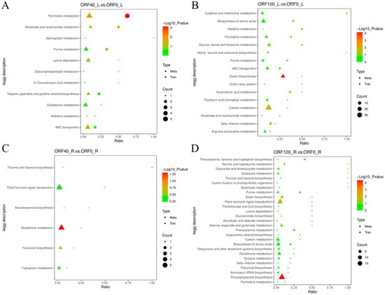 KEGG analysis reveals the regulatory mechanism in highland barley under fertilization. The enriched pathways in the (A) OFR40–L vs. OFR0–L, (B) OFR100–L vs. OFR0–L, (C) OFR40–R vs. OFR0–R, and (D) OFR100–R vs. OFR0–R groups. Integrated analysis of the top 20 KEGG pathways enriched by the differentially expressed genes (DEGs) and differentially accumulated metabolites (DAMs). The X-axis indicates the enrichment score of the DEGs and DAMs. The p-value is presented in a color scale; the sizes of the dots and triangles indicate the number of DEGs and DAMs mapped in each pathway, respectively. The blue arrows indicate amino acid metabolic pathways, and the red arrows indicate the pathways analyzed in detail.