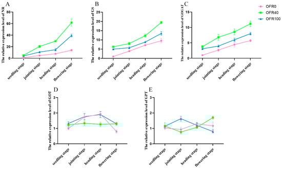 Impact of gene expression in nitrogen metabolism pathways of highland barley. This study examines the effects of fertilizer treatments, designated as OFR0, OFR40, and OFR100, on the expression levels of key genes within nitrogen metabolic pathways in highland barley. Measurements were taken at four critical growth stages: the seedling, jointing, heading, and flowering stages. (A) The relative expression level of NR. (B) The relative expression level of GS. (C) The relative expression level of GOGAT. (D) The relative expression level of GOT. (E) The relative expression level of GPT.