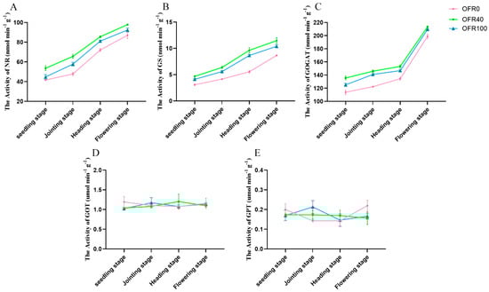 Impact of fertilizer treatments on enzyme activities in nitrogen metabolism pathways of highland barley. This study examines the effects of fertilizer treatments, designated as OFR0, OFR40, and OFR100, on the activity levels of key enzymes within nitrogen metabolic pathways in highland barley. Measurements were taken at four critical growth stages: the seedling, jointing, heading, and flowering stages. The specific enzymes analyzed include the following: (A) the activity of NR; (B) the activity of GS; (C) the activity of GOGAT; (D) the activity of GOT; (E) the activity of GPT.