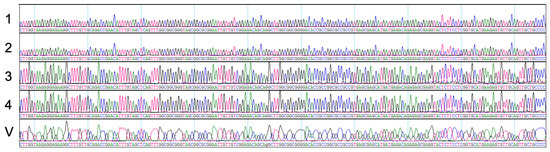 Comparison of chromatograms: partial sequences from direct sequencing of RT-PCR products from seedlings (1–4) aligned with the corresponding SCTF-1 gene sequence region in the vector (V).
