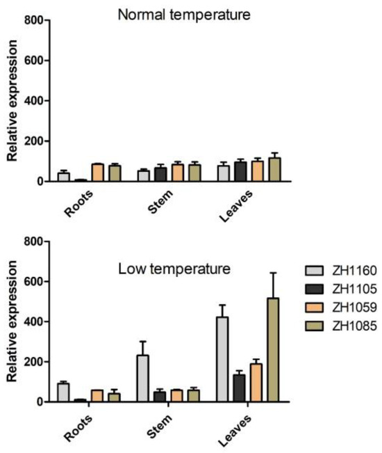 For ZH1059, low-temperature treatment significantly enhanced expression compared to normal temperature (p < 0.01), with the leaf tissue expression ratio under low vs. normal temperature being 1.9. Leaf tissue exhibited significantly higher expression than stem and root tissues (p < 0.01), with the maximum expression level observed in leaf tissue under low-temperature treatment (189.21).