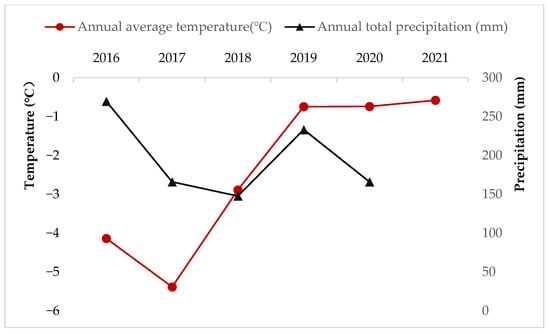 The experiment selected perennial pastures with strong adaptability, high yield, and good palatability in the agricultural and pastoral intertwined area, which were perennial pastures such as alfalfa (Medicago varia) and smooth bromegrass (Bromus inermis). The experiment adopted a randomized block design, with pasture species as the main treatment, irrigation and fertilization as the sub-treatment, mechanical tilling, and strip sowing, with row spacing of 20 cm. The sowing rate was 15.0 kg ha−1 for Medicago varia sown singly, 30.0 kg ha−1 for Bromus inermis sown singly, 7.5 kg ha−1 for Medicago varia sown in a mix, and 15 kg ha−1 for Bromus inermis in a mix. Hand pulling of weeds after seedling formation was performed to protect seedlings. The nitrogen fertilizer applied was chemically pure urea. The grass was mowed twice a year for yield determination, once in June and once in August, leaving a stubble height of 5 cm. Regarding pasture species treatments (Bromus inermis, Medicago varia, Bromus inermis and Medicago varia mixture), nitrogen fertilization treatments (CK: 0 kg N hm−2 y−1, low nitrogen: 75 kg N hm−2 y−1, and high nitrogen: 150 kg N hm−2 y−1), and irrigation treatments (CK: 0 mm water supplementation, 60 mm water supplementation in the dry season (15% of the average annual precipitation)), each experimental plot was 7 m × 10 m, with 4 replications per treatment. Refer to Table 1 for the acronyms of all treatments. Starting the experiment in June 2016, the pasture was aged 1–5 in 2017–2021. The basic physical and chemical properties of the soil of the pastureland in 2016 are shown in Table 2, as well as the temperature and precipitation during 2016–2021 being shown in Figure 1.