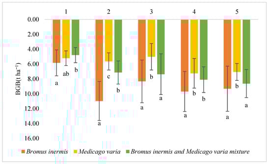 Changes in below-ground biomass of different pastures under different ages. Note: 1, 2, 3, 4, and 5 indicate the ages of pastureland, respectively. Different lowercase letters (a, b, c) indicate that there is a significant difference in BGB between different pasture treatments under the same age (p < 0.05).