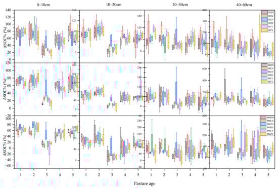 Among the five factors of grass, N, water, age, and soil depth, age and soil depth had highly significant effects on the rate of change in SOC content (p < 0.001); there were significant two-by-two interactions between pasture species and N fertilization, and between pasture age and soil depth (p < 0.05); and there were significant (p < 0.05) three-way interactions between pasture species, N fertilization, and soil depth (p < 0.05), and between water, N application, and soil depth (p < 0.05); there was also a significant interaction (p < 0.05) between four factors: pasture species, N fertilization, water, and soil depth (Table 4). Among them, the age of cultivated grasses had a significant effect on SOCs (p < 0.05), and it had a significant two-by-two interaction with soil depth (p < 0.05).