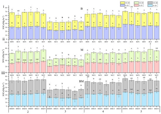 From Figure 4iii, in the 0–10 cm soil layer, under the condition of the same treatment with different ages, BMZY with 5 years of planting had the highest SOCs of 39.15 Mg ha−1, and BMLY with 3 years of planting had the lowest SOCs of 19.08 Mg ha−1. In the 10–20 cm soil layer, BMHY with 2 years of planting had the highest SOCs of 37.06 Mg ha−1, and BMHN with 3 years of planting had the lowest SOCs of 20.90 Mg ha−1. For the characteristics of SOC changes among different soil layers, the SOCs of the 0–10 cm and 10–20 cm layers were close to each other, but with the increase in grasses’ age, the SOCs of the 0–10 cm layer were larger than those of the 10–20 cm layer. In all the treatments with the mixture of ages 1 to 5 years, the surface layer 0–10 cm was highest in treatment BMZY, which was 17.92% higher compared to BMHY treatment (lowest), and 10–20 cm was highest in treatment BMHN SOCs, which was 25.06% higher compared to BMZY treatment (lowest).