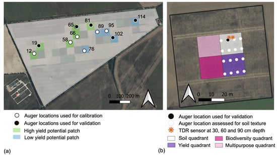 The patchCROP landscape laboratory. (a) Locations used for calibration or validation (numbers indicate the patch ID); (b) exemplary image for patch 81 for pairing the soil moisture sensor with the soil auger information (black line indicates the patch border, black and white dots indicate locations where soil augers were taken and assessed for soil texture up to 1 m depth, black dot indicates the location chosen for simulation).