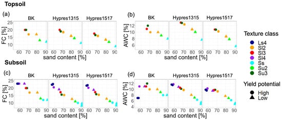 Field capacity (FC) (%) and available water capacity (AWC) (%) by pedotransfer function setup for top- (a,b) and subsoil (c,d) by soil textural class and yield potential zone. BK = based on the German manual of soil mapping; Hypres1315 = Hypres pedotransfer function with bulk density of 1.3 g/cm3 in the topsoil layer and 1.5 g/cm3 in the subsoil layers; Hypres1517 = Hypres pedotransfer function with bulk density of 1.5 g/cm3 in the topsoil layer and 1.7 g/cm3 in the subsoil layers; Ss = sandy sand, Su2 = slightly silty sand, Su3 = medium silty sand, Sl2 = slightly loamy sand, Sl3 = medium loamy sand, Sl4 = strongly loamy sand, Ls4 = strongly sandy loam.