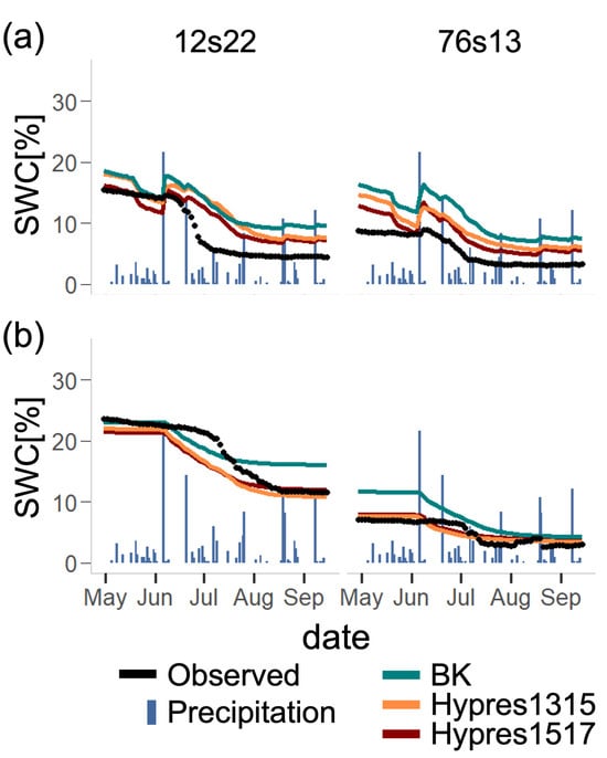Daily simulated (line color indicates model setup) and observed (black line) volumetric water content (SWC) (%) for two contrasting locations, 12s22 and 76s13, at the patchCROP experimental site during maize crop growth in 2022 for (a) 30 cm depth (soil textural classes Sl3 (12s22) and Sl2 (76s13)) and (b) 90 cm depth (soil textural classes Ls4 (12s22) and Ss (76s13)); blue bars indicate daily precipitation (mm); BK = based on the German manual of soil mapping KA5; Hypres1315 = Hypres pedotransfer function with bulk density of 1.3 g/cm3 in the topsoil layer and 1.5 g/cm3 in the subsoil layers; Hypres1517 = Hypres pedotransfer function with bulk density of 1.5 g/cm3 in the topsoil layer and 1.7 g/cm3 in the subsoil layers.