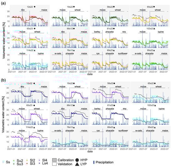 Daily simulated (colored line indicates soil textural class) and observed (black line) volumetric water content (%) for the selected locations at the patchCROP experimental site for (a) 30 cm depth and (b) 90 cm depth from 01/01/2021 to 15/09/2022 for the calibrated (white background) and validated (grey background) Hypres1517 model setup (soil hydraulic properties based on Hypres pedotransfer function with bulk density of 1.5 g/cm3 in the topsoil layer and 1.7 g/cm3 in the subsoil layers; crop names indicate their respective growing season length; blue bars indicate daily precipitation (mm); Ss = sandy sand, Su2 = slightly silty sand, Su3 = medium silty sand, Sl2 = slightly loamy sand, Sl3 = medium loamy sand, Sl4 = strongly loamy sand, Ls4 = strongly sandy loam; HYP = auger located within the high yield potential area of the field; LYP = auger located within the low yield potential area of the field.