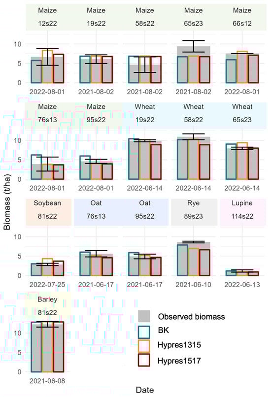 For the prediction of barley biomass in 2021, the PTF setup did not have a relevant impact, while for maize, winter wheat, soybean, winter oat and winter rye differences were apparent, although in some locations the difference in biomass simulation due to model setup were all within the standard deviation of the observed biomass (Figure 5). Comparing the two Hypres setups, the higher bulk density led to either no difference in biomass predictions or a reduction in biomass. This effect was more pronounced at locations featuring rather loamy soil textural classes, which is in line with the higher impact of bulk density on available water capacity for soil textural classes with lower sand content (Figure 2). The biggest difference regarding accuracy of biomass predictions due to bulk density was found within the texture class Ls4, where the Hypres1517 setup performed better compared to Hypres1315 (rRMSE 9.1 and 16.3%, Table S3). Regarding the simulation of maize biomass, both Hypres setups better captured the impact of soil heterogeneity on crop growth than the BK. Using the Hypres1517 setup, the model predicted a maize biomass of 3.7 t/ha for the sandy location (76s13) and 7.1 t/ha for the location with loamy subsoil (66s12) in 2022, which was similar to the observed biomass, while using the BK setup the soil conditions did not lead to differentiation, with a predicted biomass of 6.2 and 6 t/ha, respectively. The predicted biomass was even higher in the sandy than the loamy location, which was not reflected by the observations. The available water capacity when applying the BK PTF was surprisingly low for textural class Ls4 (7%) (Figure 2), even though the field capacity was similar to other setups, as previously highlighted regarding the SWC simulation (Figure 3). While the biomass predictions were lower using the BK compared to the Hypres PTF in profiles with Ls4 in the last layer, it did not lead to a major increase in prediction error for biomass (Table S3). Instead, the relatively high available water capacity for the texture class Ss led to biomass over predictions, which also led to a relatively high rRMSE of 24.6% when using the BK at locations with Ss as the subsoil texture (Table S3), consequently limiting the sensitivity to capture differences in biomass due to soil conditions. While the Hypres setups were able to capture differences between very contrasting soil conditions, in locations with loamy subsoil the predicted biomass was often similar.