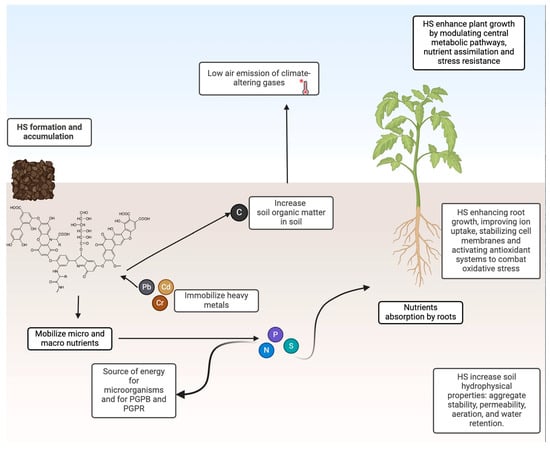Sustainable agriculture is fundamental to addressing the growing challenges of global food security, soil degradation, and environmental sustainability in the face of climate change and population growth. By 2050, the global population is expected to reach 9.7 billion, necessitating a 70% increase in food production [1]. Unlike conventional farming, which often leads to soil erosion, water pollution, and biodiversity loss, sustainable agriculture integrates ecological principles to maintain productivity while safeguarding natural resources [2]. Core objectives include enhancing soil fertility, minimizing pollution, promoting biodiversity, and ensuring long-term economic viability for farmers [3,4]. Sustainable practices such as crop rotation, conservation tillage, organic farming, and agroforestry improve soil health and resilience [5]. Precision agriculture, which leverages digital technologies and data analytics, also supports sustainable goals by optimizing resource use and reducing environmental impact [6]. In addition, integrated nutrient management strategies, including the use of organic amendments like HSs, play a critical role in enhancing soil structure and nutrient availability [7,8,9]. HSs, derived from decomposed organic matter, have been identified as key contributors to sustainable soil management. They improve cation exchange capacity (CEC), water retention, and microbial diversity, which are essential for maintaining soil productivity under sustainable agricultural systems (Figure 1) [10]. Recent studies highlighted that HSs can also enhance plant resilience to drought and nutrient stress, making them particularly valuable in the context of climate change [11]. The action of HSs on plants occurs in two ways—indirectly, as a modification of soil properties, and as a direct impact on physical and metabolic plant processes. Furthermore, Nardi et al. [12] demonstrated how the HSs and their fractions positively affect primary and secondary metabolic pathways of plants both in laboratory and field studies. The considerable effect of HSs on lateral root induction and root hair growth might be caused by changes in energetic and nitrogen pathways and transport across membranes. HSs influence plant nutrition and development through closely related mechanisms that are hormone-dependent.