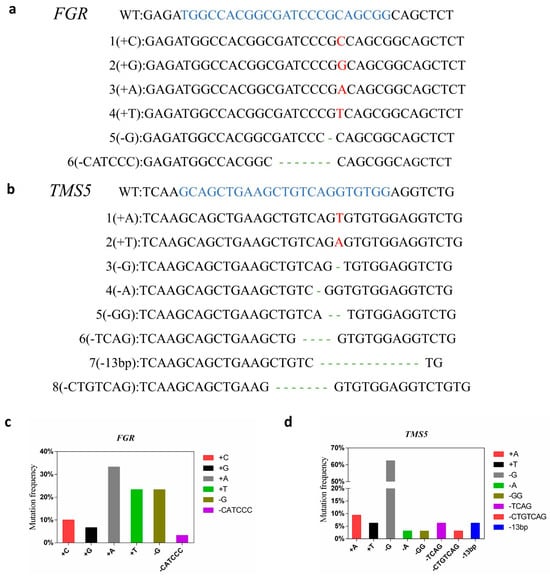 Analysis of TMS5 and FGR mutation types. (a) The mutant genotypes of FGR; (b) the mutant genotypes of TMS5. The blue letters are the target sequences (including the PAM site), the red letters are insert bases, and the dashes show deletions. (c) Frequency of the mutation types of FGR; (d) frequency of the mutation types of TMS5.
