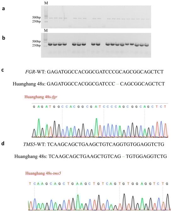 Genotyping of homozygous mutants without T-DNA elements. (a) PCR detection of Cas9 in T1 generation mutants; (b) PCR detection of hygromycin in T1 generation mutants with M. DL2000 DNA markers; (c) mutation types of FGR in Huahang 48s; and (d) mutation types of TMS5 in Huahang 48s.