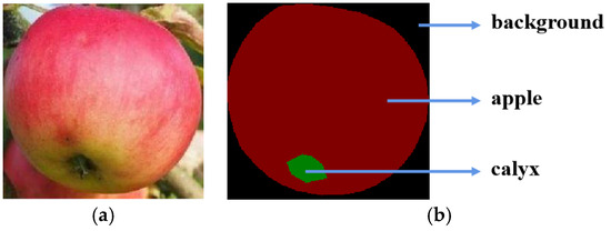 In this paper, a target recognition network was used to identify the growth pattern of apples as well as the position. After obtaining the classification of apple growth patterns, the identified unshaded apples needed to be subjected to processing such as semantic segmentation and minimum outlier features, so as to obtain the position of the unoccluded apples. Independent images of unobstructed apples were obtained by cropping the unobstructed fruit regions. After screening, 1500 images were used as raw data for semantic segmentation and labeled according to three parts: background, apple and calyx, as shown in Figure 2. This dataset, named apple-mono, was divided into training, validation and test sets in a ratio of 6:2:2.
