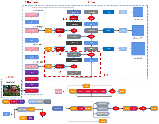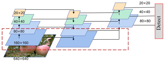 Therefore, when facing target fruits with small differences in growth morphology, the original network structure cannot effectively extract and fuse the local features of small occlusions, resulting in the loss of local information on the occluded part of the fruit and the incorrect recognition of the fruit growth morphology. YOLOv7 extracts the key features from the maps of the backbone network of 80 × 80, 40 × 40 and 20 × 20, respectively, and performs feature fusion, so as to better distinguish the growth morphology of apples with small occlusions. Thus, the growth morphology of slightly occluded apples can be better discriminated, and the classification and recognition accuracy can be improved. The method adds a 160 × 160 feature scale on the basis of the original three scales, filling the gap between high resolution (such as 320 × 320) and low resolution (80 × 80), thus allowing more local information to be obtained and reducing missed detection. The method then outputs the extracted features to the original 160 × 160 feature map of the backbone network and fuses the features on this scale with the features on the original three scales; the specific structure is shown in Figure 5.