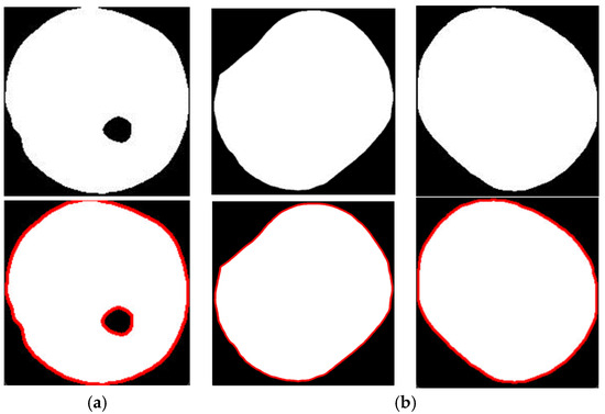After classifying and recognizing the growth patterns of apples, accurate recognition of the attitude of the apples is required for the end-effector to pick the fruits in an appropriate manner. However, during the picking process, images of apples captured from one viewpoint of the apple picking robot usually include branch-obstructed, leaf-obstructed and overlapping fruits. As the robot moves, the overlapping or heavily occluded apples may be visible from another viewpoint, and occluded fruits may become unoccluded after other fruits are picked; therefore, it is possible to consider recognizing only the apple position in the unoccluded state. In fruit position recognition, the growth pattern of apples is first classified using the improved YOLOv7, and the unobstructed fruit region is cropped to obtain an independent image of unobstructed apples. The apples are categorized into two types according to whether the calyx can be seen or not; those with a visible calyx are growth type 1, and all others are growth type 2. Based on this, the UNet algorithm is implemented to segment the regions of apples in cropped images. On this basis, the UNet algorithm is used to segment the apple region in the cropped image, in which the calyx region is also segmented for apples of growth type 1. After that, the segmented image is binarized, and the contour features of the apple and calyx are obtained by the contour extraction algorithm, as shown in Figure 7.