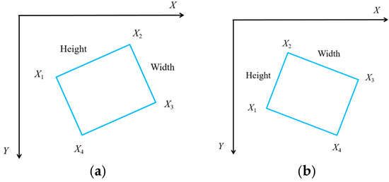 In this case, growth type 1 uses the two centers of the smallest outer circles of the fruit and calyx contours, connects the two centers and uses the direction from the calyx center point to the fruit center point as the arrow direction, so as to obtain the apple’s spatial orientation. For apples of growth type 2, information is obtained about the center point, width, height and rotation angle of the minimum outer rectangle, where X1, X2, X3 and X4 are the coordinates of the four points of the minimum outer rectangle, representing the point with the smallest horizontal coordinate, the point with the smallest vertical coordinate, the point with the largest horizontal coordinate and the point with the largest vertical coordinate, respectively. The distance from X1 to X2 is defined as the height, the distance from X2 to X3 is defined as the width and the angle of the horizontal line rotated clockwise to the first wide edge is taken as the rotation angle; a schematic diagram of the minimum outer rectangle is shown in Figure 8.
