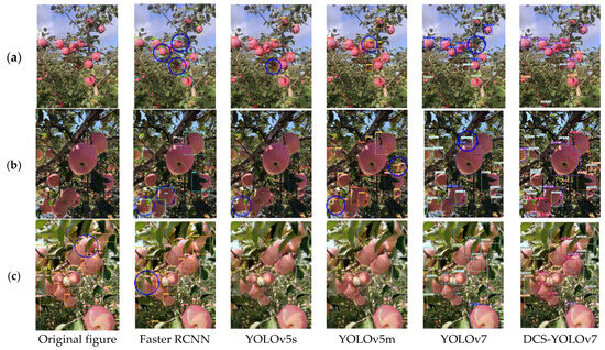 In order to verify the detection effect of DCS-YOLOv7 on the apple growth morphology dataset, the optimal weights obtained from the training were used to test on the test set, and the Faster RCNN [30], YOLOv5s, YOLOv5m, YOLOv7 and DCS-YOLOv7 recognition effects were compared with the results of the recognition under different lighting as shown in Figure 11.