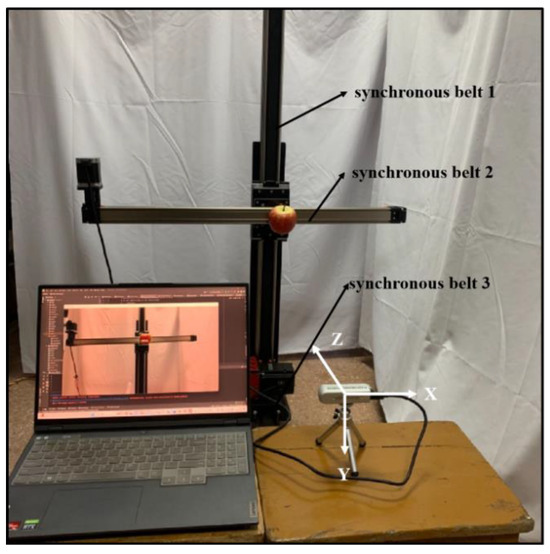 In this experiment, on the basis of completing the construction of the positioning system and obtaining the internal and external parameters of the camera through the camera calibration experiment, the RealSense D435i depth camera (Inter, Santa Clara, CA, USA) was used to identify and locate the apples. The depth module was used to obtain the depth information of the center position of the apple, and the 3D spatial coordinates of the apple in the image were calculated by using the camera coordinate transformation relation, realizing the recognition and localization of the apple fruit and verifying the 3D localization accuracy of the coordinates of the apple center point measured after the camera calibration. The experiments in this section were all carried out in a laboratory environment, and the apple visual positioning system built in the experiment is shown in Figure 14. It consisted of stepper motors, synchronous belts, sliders and a RealSense D435i depth camera. The apple was fixed on an experimental platform capable of XYZ three-degree-of-freedom motion, and it was used to test the positioning errors in the X-direction, Y-direction and Z-direction. The recognition and localization algorithm developed in this paper could identify the growth pattern and attitude of each apple in the computer interface in real time. Rectangular boxes indicated the growth patterns of four types of apples, namely, unobstructed, leaf-obstructed, fruit-obstructed and branch-obstructed, which were marked with uo, lo, fo and bo, respectively, in the upper left corner of the rectangular box. The direction of the arrows indicated the attitude of the unobstructed fruits; meanwhile, the 3D coordinate information of the apple was displayed in the center of the apple bounding box in real time.