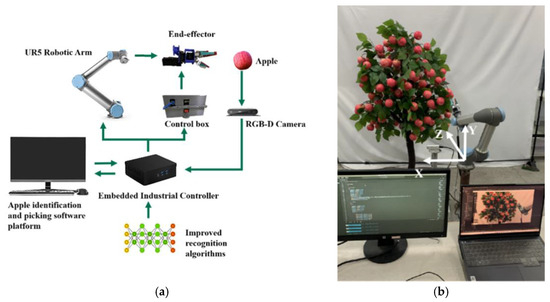 Apple picking system. (a) Hardware composition. (b) Equipment integration.