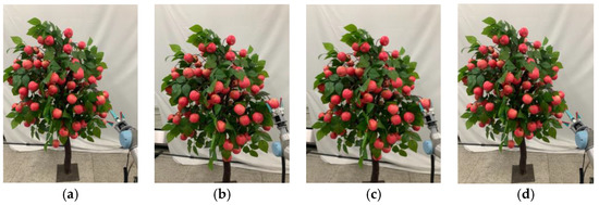 The apple picking experiment process is shown in Figure 16. Before performing the grasping, the robotic arm is in the default attitude and waits for the arrival of the picking command, as shown in Figure 16a. After obtaining the three-dimensional coordinates of the apple, the robotic arm adjusts its attitude to approach the fruit in a translational manner and controls the gripper jaws to open to grasp it, as shown in Figure 16b,c. Then, as shown in Figure 16d, after picking, the robot arm returns to the initial position by clamping the apples, completing this apple picking and waiting for the next round of picking.