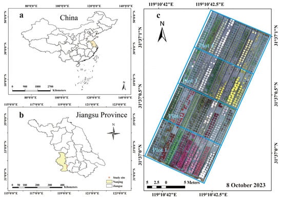 Overview of the experimental area. (a) Location of China; (b) Location of Nanjing, Jiangsu Province; (c) UAV orthophoto of the experimental field. Plant images from plots 2 and 3 were used to establish flowering-period classification dataset 1, while images from plots 1 and 4 were used to establish flowering-period classification dataset 2.