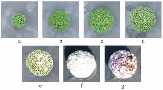 Pictures of garden chrysanthemums at different growth stages. (a,b) represent the vegetative growth period; (c,d) represent the budding period; (e–g) represent the flowering period.