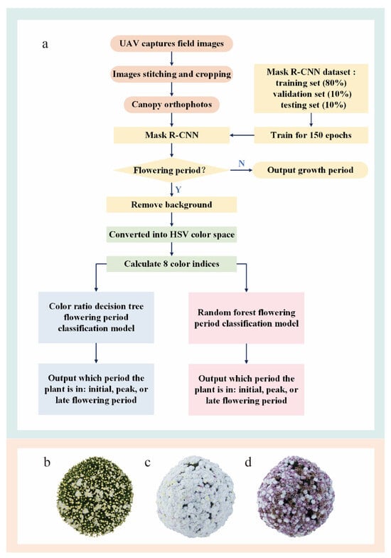 (a) Flowering-period classification flowchart, Y means that the condition is met, and N means that the condition is unmet; (b) represents the initial flowering period; (c) represents the peak flowering period; (d) represents the late flowering period.