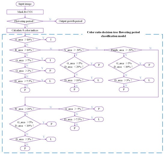 Color ratio decision tree flowering-period classification model. I represents the initial flowering period; P represents the peak flowering period; L represents the late flowering period; Y means that the condition is met, and N means that the condition is unmet.