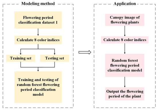 Monitoring the flowering period is essential for evaluating garden chrysanthemum cultivars and their landscaping use. However, traditional field observation methods are labor-intensive. This study proposes a classification method based on color information from canopy digital images. In this study, an unmanned aerial vehicle (UAV) with a red-green-blue (RGB) sensor was utilized to capture orthophotos of garden chrysanthemums. A mask region-convolutional neural network (Mask R-CNN) was employed to remove field backgrounds and categorize growth stages into vegetative, bud, and flowering periods. Images were then converted to the hue-saturation-value (HSV) color space to calculate eight color indices: R_ratio, Y_ratio, G_ratio, Pink_ratio, Purple_ratio, W_ratio, D_ratio, and Fsum_ratio, representing various color proportions. A color ratio decision tree and random forest model were developed to further subdivide the flowering period into initial, peak, and late periods. The results showed that the random forest model performed better with F1-scores of 0.9040 and 0.8697 on two validation datasets, requiring less manual involvement. This method provides a rapid and detailed assessment of flowering periods, aiding in the evaluation of new chrysanthemum cultivars.