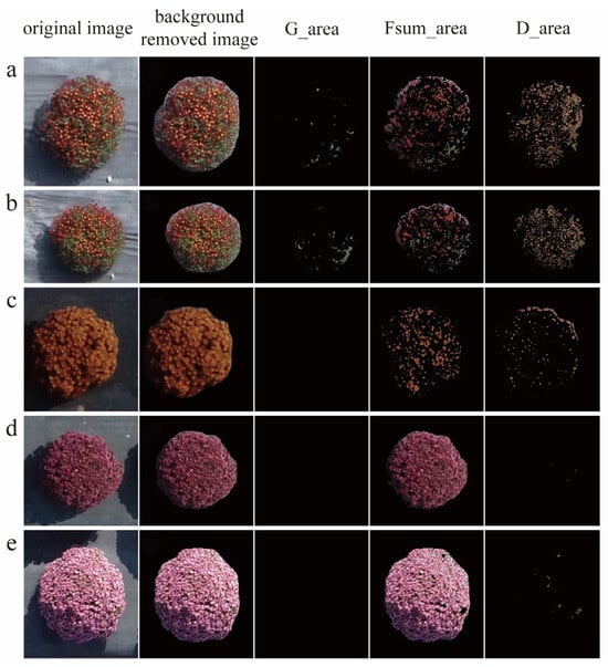 Color information of misclassified plants. (a,b) are plants in the initial flowering period that have been mistakenly identified as late flowering period; (c–e) are plants in the late flowering period that were mistakenly classified as peak flowering. G_area represents the green area extracted from the canopy image based on the previously defined conditions, Fsum_area represents the inflorescence area, and D_area represents the deteriorated area.