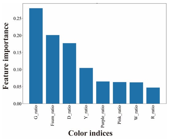 The random forest flowering-period classification model, constructed using 604 data samples from flowering-period classification dataset 1, achieved precision, recall, and F1-score all exceeding 0.95. Figure 7 illustrates the contribution rates of the eight feature variables to the model, with the G_ratio making the most significant contribution. This highlights the crucial role of the proportion of green areas in canopy images for classifying the flowering periods of garden chrysanthemums. Additionally, the Fsum_ratio and D_ratio also demonstrated considerable contributions, emphasizing the importance of flower coverage and the proportion of deteriorated characteristic regions in the flowering- period classification.