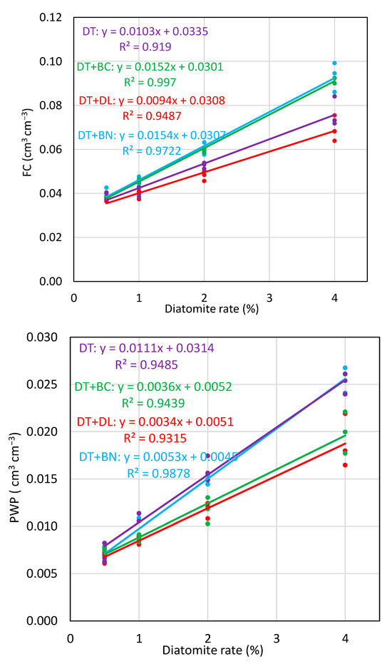 Relationship between field water capacity (FC) and plant wilting point (PWP) and diatomite rate. DT, diatomite without additives; DT + BC, diatomite with biochar; DT + DL, diatomite with dolomite, DT + BN diatomite with bentonite.