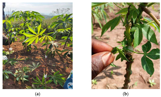 In this study, preliminary evaluations were carried out in various trials to identify non-infected plants and clones at 2- and 3-month ages, respectively, using CMD and CBSD. All the plants with CMD scores greater than 3 and CBSD scores greater than 1 from the grafting candidates were discarded. CBSD is known to be caused by two distinct strains: Cassava brown streak virus (CBSV) and Ugandan cassava brown streak virus (UCBSV). Both CMD and CBSD are transmitted by Bemisia tabaci. Cassava plants from the established trials (Table 1) were grafted 2 months after planting (MAP), for cassava plants developing from stem cuttings, and at 3 MAP for infection of cassava seedlings, using scions from infected plants essentially as described by Storey and Sheat et al. [12,13]. Infected cassava plants from the varieties OBAMA (TME 419) and NAROCASS 1 [11] served as virus sources to provide scions as inoculum for the grafting experiments. Stem cuttings encompassing 2–4 buds were excised from infected plants and cut into a wedge shape for insertion into the rootstock. An oblique cleft cut of 1–2 cm into the stem cambium of the rootstock plant was done and the wedge-shaped scion was inserted (Figure 1a). Care was taken that the vascular tissues of scion and rootstock joined in order to guarantee transfer of virus through phloem connections. The wound region was tightly closed with parafilm at the graft union to prevent desiccation, and the parafilm was removed after approximately 10 days. Leaving 1 to 2 leaves above the graft union, the rootstock was decapitated to force symptom development on fresh leaves developing from newly sprouting buds (Figure 1b). Plants were routinely indexed for symptom expression. Plants developing symptoms on newly expanding leaves were considered to be virus susceptible, while plants with CMD scores greater than 3 and CBSD scores greater than 1 were discarded. All cassava plants that did not show CBSD symptoms were subjected to RT-qPCR for virus detection.